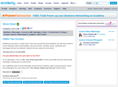 If you definitely want to be permanently removed from Ecademy, type in your password, check the confirmation box and choose the ‘Yes. Please delete my account’ button below.