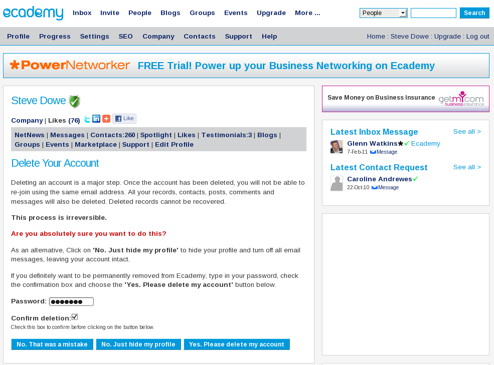 If you definitely want to be permanently removed from Ecademy, type in your password, check the confirmation box and choose the ‘Yes. Please delete my account’ button below.