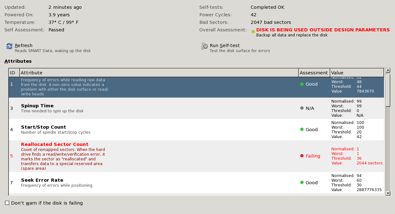 It all starts with that strange sound… In my machine’s case, a whining noise. As a sysadmin and/or experienced geek, you know something’s wrong. I suspect the head assembly has become detached and is scraping along the disk surface at 7200rpm…