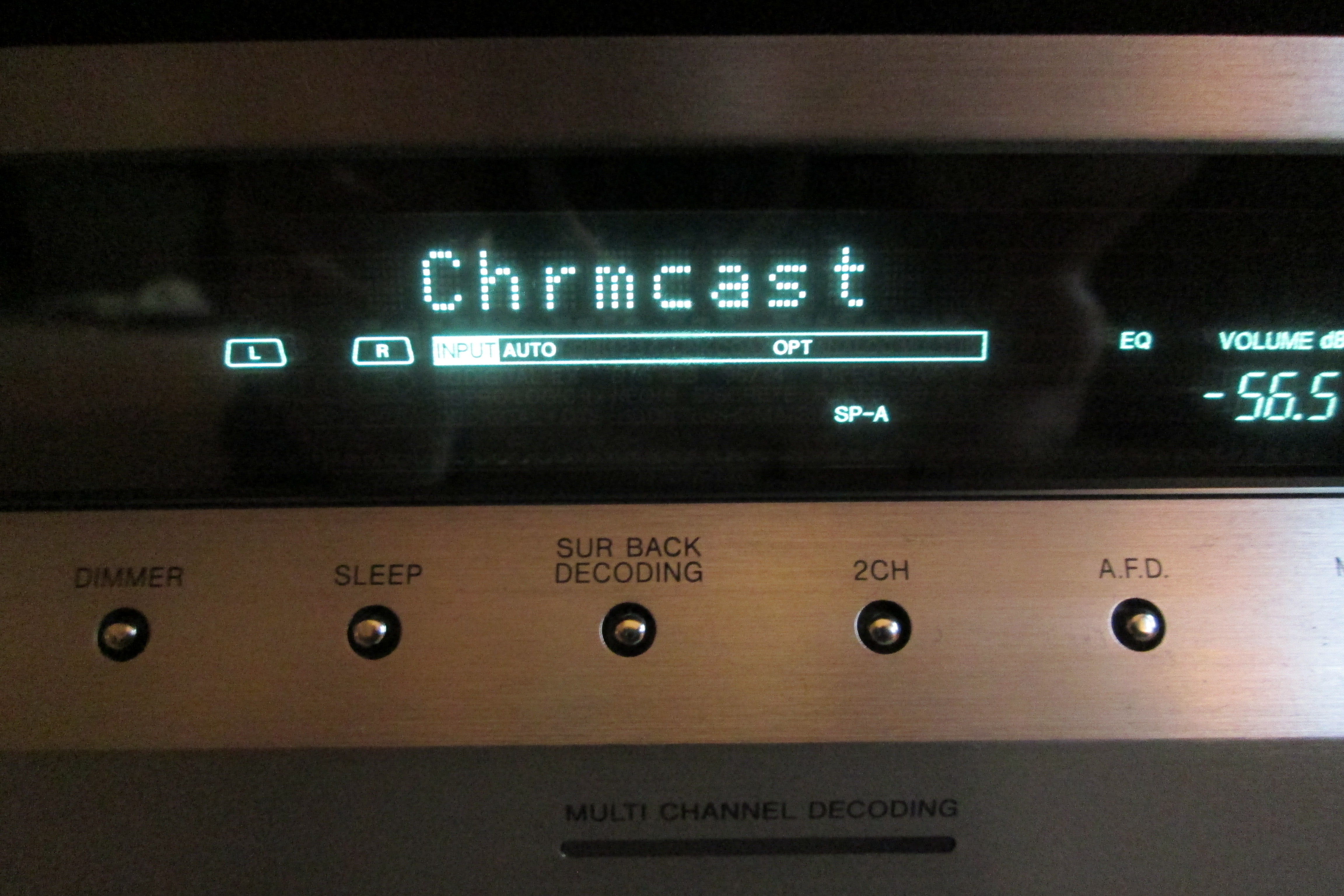But… what if the Chromecast thinks it is sorted with its display device? Strangely, this seems achievable by plugging the Chromecast into the HDMI splitter’s HDMI input, and then plugging the HDMI splitter’s output into the A/V amp’s output. Yep, let me repeat: connecting the HDMI splitter’s output to the amp’s output connector (which would normally go to a monitor) strangely seemed to fool the Chromecast into happily sending forth its content to the HDMI splitter, from which the optical feed supplies PCM audio at 48khz straight into the amp.